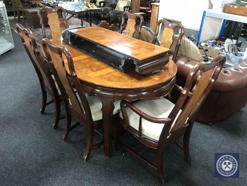 An oriental style oval extending dining table with two leaves, with a set of six chairs