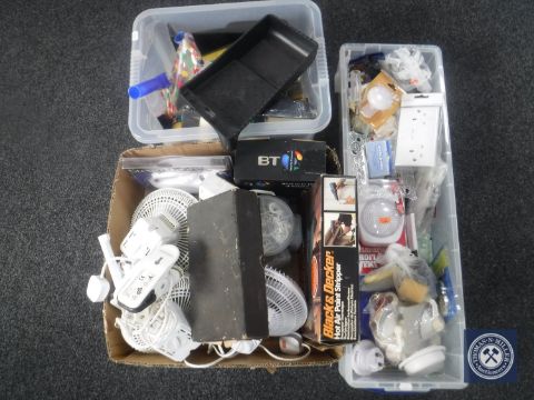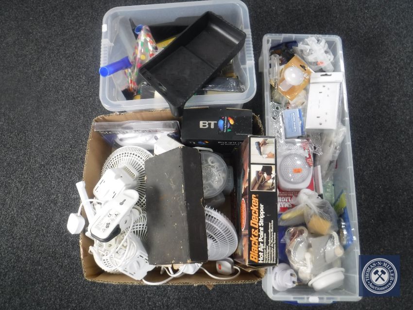 Three boxes of assorted electricals, fittings, paint brushes, paint stripper, wood working plane etc