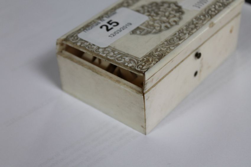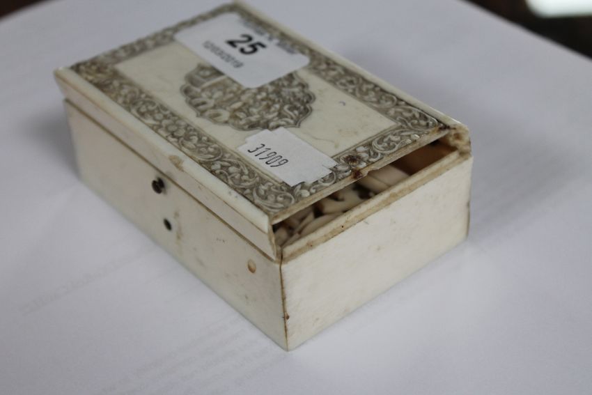 A carved antique ivory box containing a quantity of ivory letters