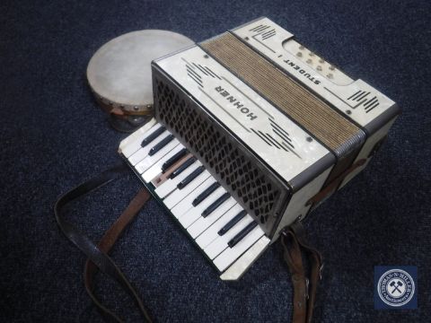 A Hohner Student 1 accordion and a tambourine