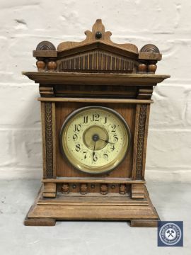 A mahogany and pine cased Junghans mantel clock with enamelled dial