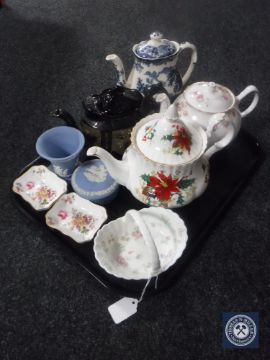 Two pieces of Wedgwood jasper ware, two Royal Crown Derby shallow dishes, teapots etc