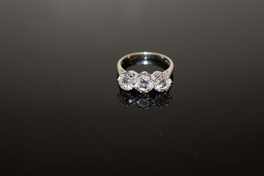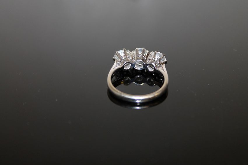 An 18ct white gold three-stone diamond ring, three brilliant-cut stones within raised claw settings, to a plain shank, the total diamond weight assessed at 2.40 carat, H/I colour, SI1/SI2 clarity, hallmarked London 1975, size O. * Valued for insurance by Goldsmiths 03/12/18 for the sum of £15,400. With certification. CONDITION REPORT: The central stone is approximately 0.9 carat. The outer two are slightly smaller at approximately 0.75 carat. To the naked eye the diamonds appear virtually the same size.