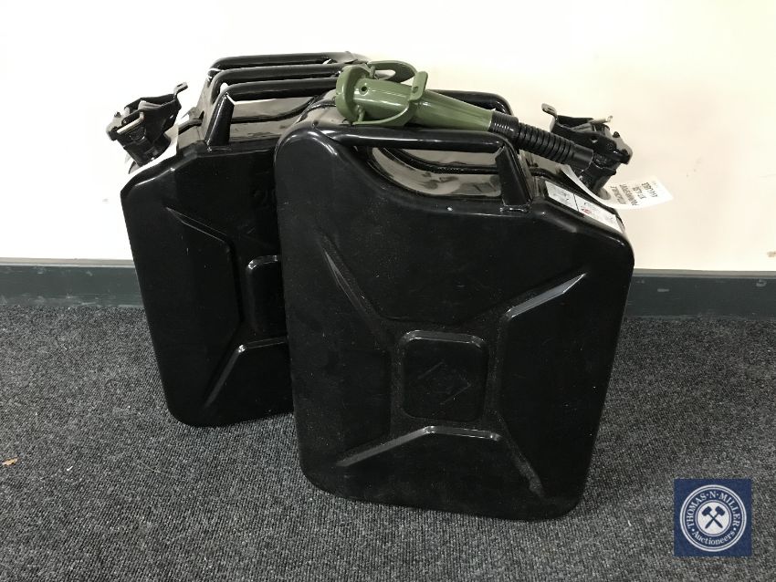 Two 20 litre Black Steel jerry cans with one filling nozzle