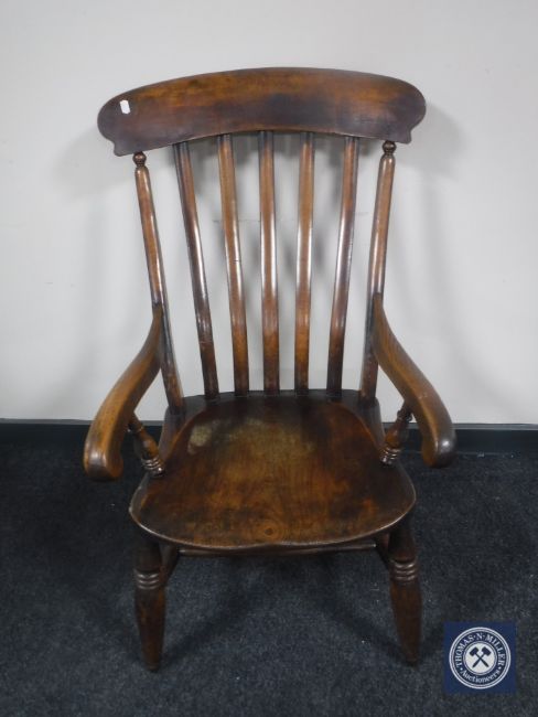 An antique elm kitchen armchair