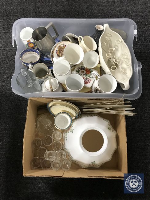 Two boxes of china and glass ware - hand painted oil lamps, shade, commemorative china etc and two framed Newcastle prints