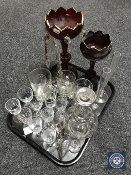 A tray of lustres, Victorian goblets, decanter and drinking glasses
