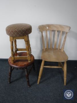 A pine kitchen chair together with a pine stool and an oak upholstered pub stool