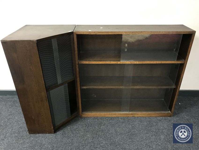 A set of oak sliding glass door bookcase together with an oak glazed corner cabinet