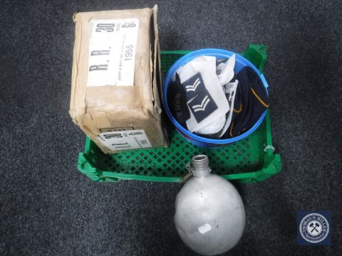 A crate of military issue hat liners, cloth badges, drinks canteen