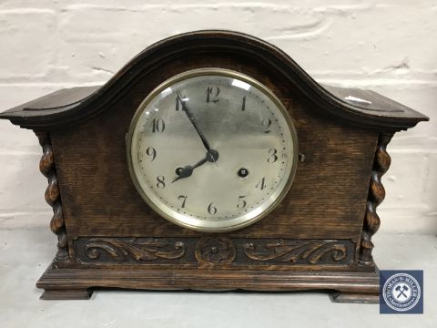 An oak cased Junghans mantel clock with barley twist supports and enamelled dial, with pendulum