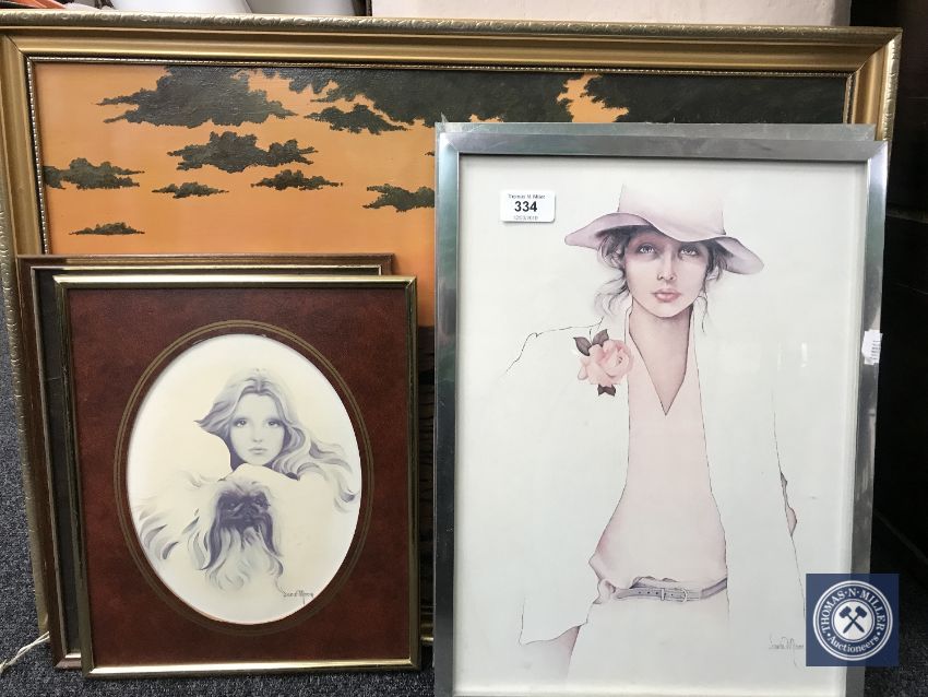 Four chrome framed Sarah Moon prints depicting ladies together with an oil on board by A. Graham, Sunset of Sea