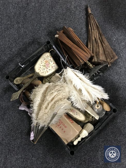 A basket of vintage feather hand fans, petit point dressing table brushes, part Victorian parasol, perfume bottles, etc