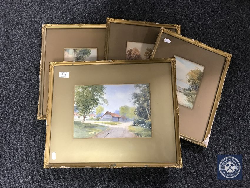 Three 20th century gilt framed watercolours signed by O. Waite, together with one other gilt framed watercolour and a print