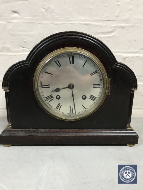 A mahogany cased mantel clock with silvered dial, with pendulum
