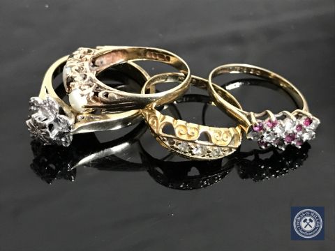 A 9ct gold diamond cluster ring, an opal and garnet ring, a ruby and diamond ring and an 18ct gold ring (4)