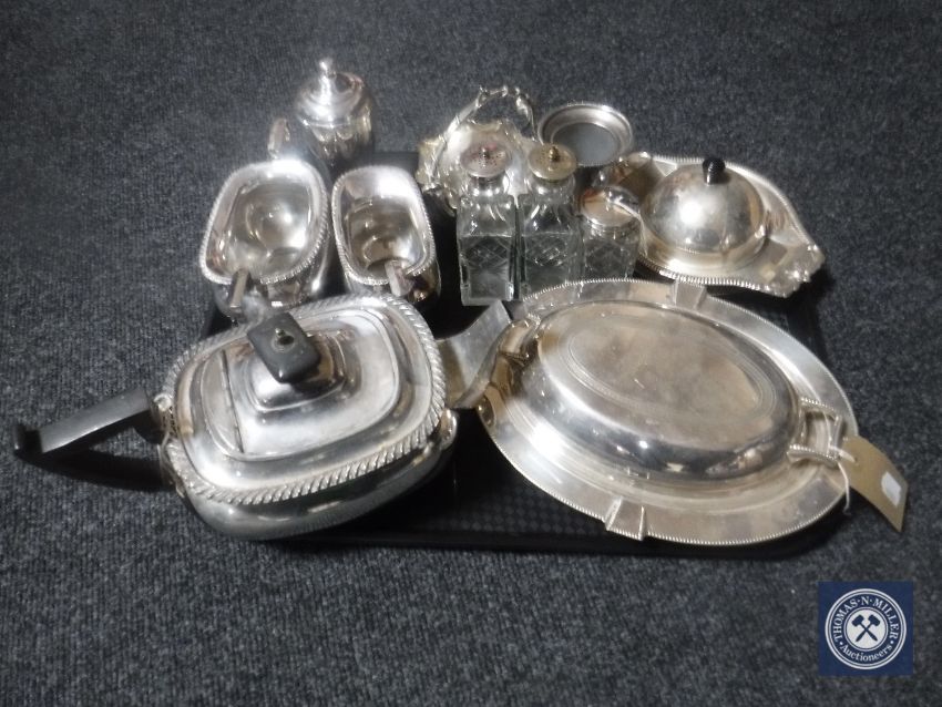 A tray of antique plated wares including muffin dish and cover, entree dish, three-piece Walker & Hall tea service, cruet set