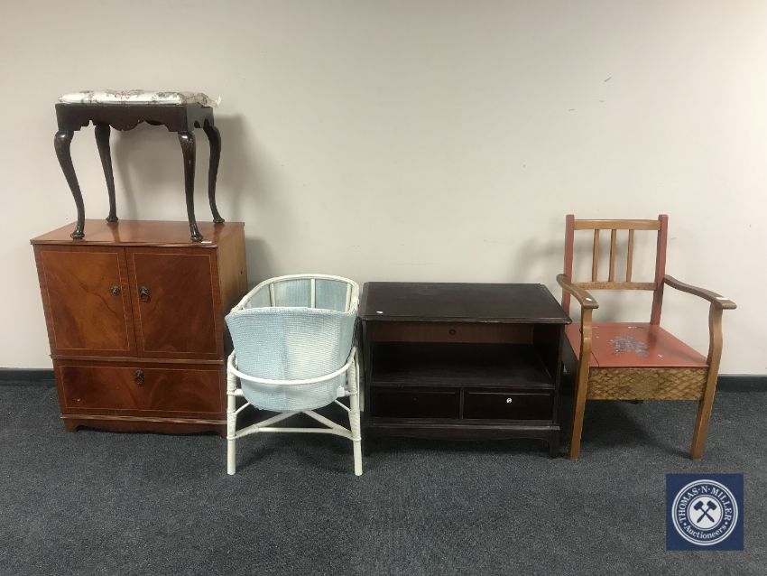 A painted commode armchair, dressing table stool, wicker crib on stand and two TV units