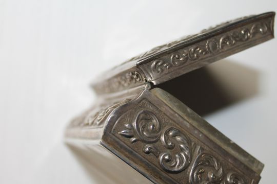 131g. This measures 9cm by 7cm by 4cm. There is a small split near the hinge on the back. There are a couple of dents to the underside. Generally in good condition.