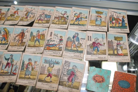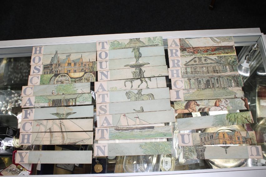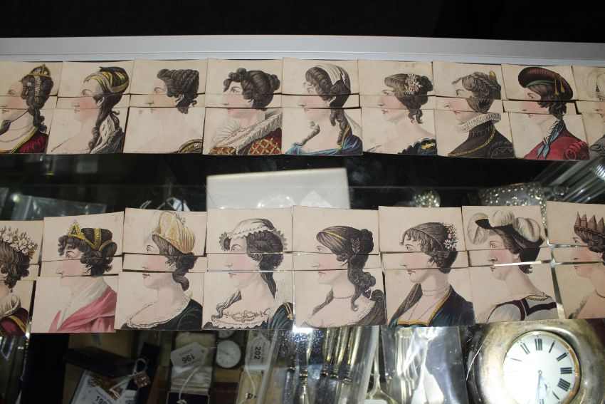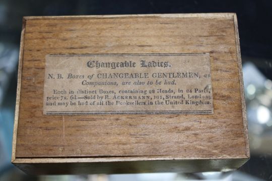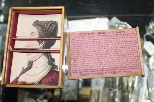 A good collection with some early 19th century pieces. The Alphabet game is complete with 25 plaques (I and J are together). The Changeable Ladies game should have 28 characters divided into thirds. There are only 27 ladies and one of the lower thirds is missing. See numerous additional images outlining the remaining contents.