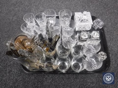 A tray containing assorted glass ware including drinking glasses, etched glass jug, pair of inkwells, together with assorted flatware