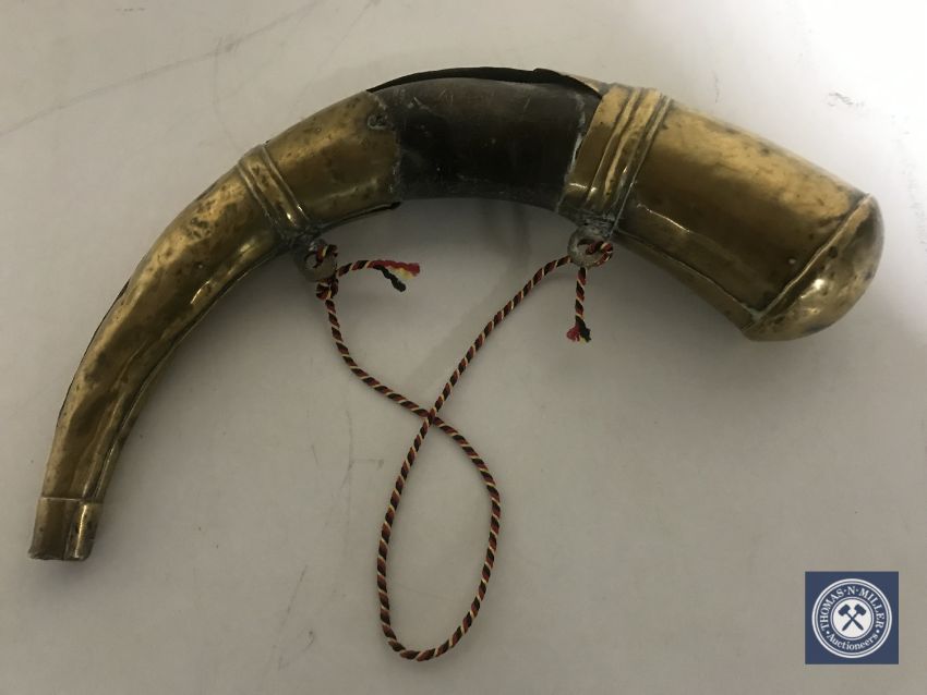A 20th century brass and horn shot flask