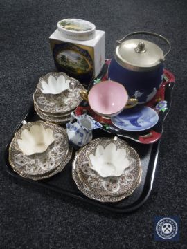 A tray of antique china trios, Wedgwood plated biscuit barrel, Royal Cauldron tea caddy, Royal Copenhagen plate and jug, etc