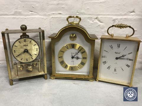 Two brass cased battery operated clocks by Ojival and Swiza, and an anniversary wind up clock by Kundo.