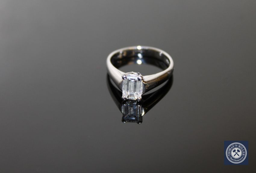 An 18ct white gold diamond solitaire ring, an emerald-cut diamond in a four-claw setting set on a plain shank, the diamond assessed as weighing 1.02 carats, Clarity VS1 and Colour E, size K. * Valued for insurance by Davidson's 21/09/13 for the sum of £10,000. With certification.
