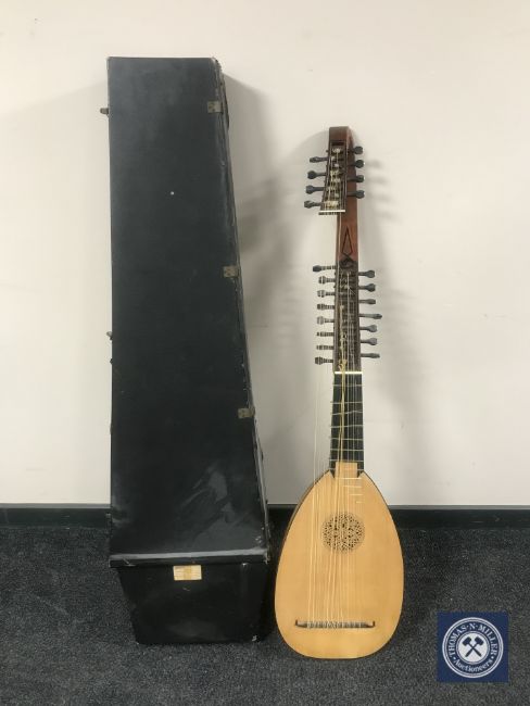 A 23-stringed bowl back lute in carry case