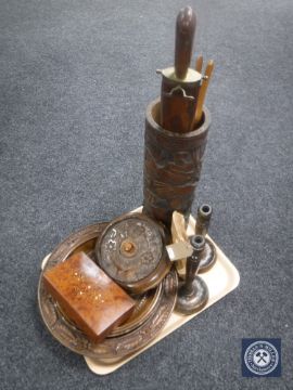 A tray of assorted wooden pieces including carved hardwood stick pot, two carved oak bowls, lidded pot, candlesticks etc