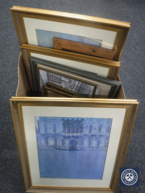 A box of assorted gilt framed prints, picture frames, relief wall plaque