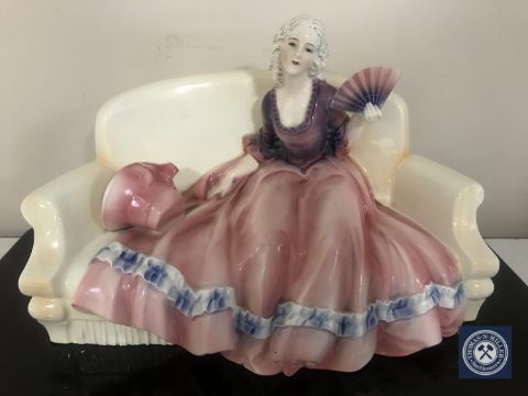 A Kathaus porcelain figure of lady seated on a couch holding a fan