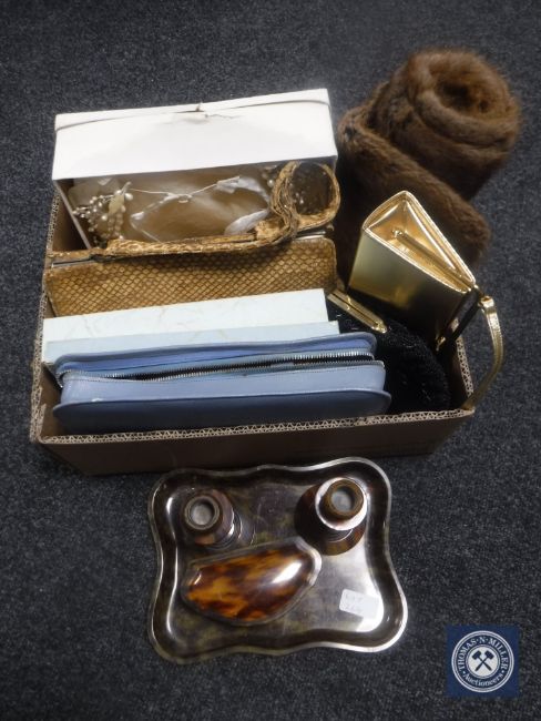 A box containing vintage handbags and beaded purse, snakeskin purse, fur wrap, part cased travel set, beaded collar, four-piece faux tortoiseshell dressing table set