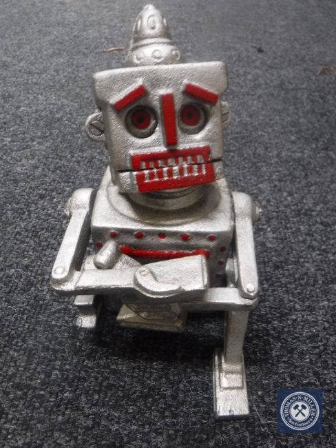 A cast metal robot money box