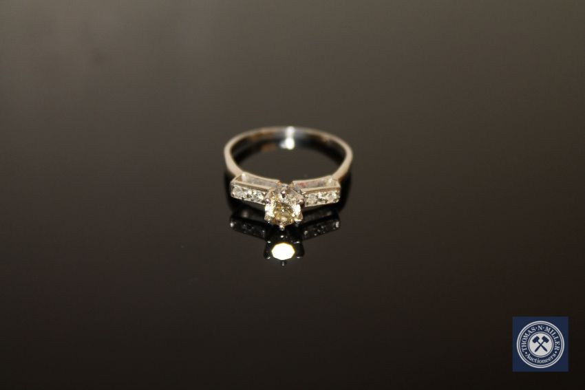 A diamond solitaire ring, a brilliant-cut diamond within a raised claw setting upon diamond set shoulders, to a plain shank, the total diamond weight estimated at 0.50 carat, size M
