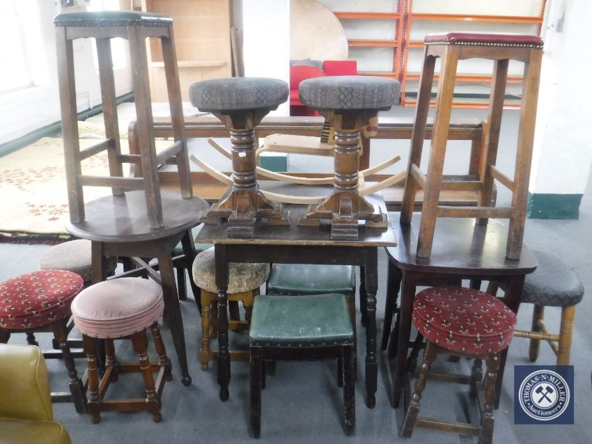 Three bar tables, sixteen assorted bar stools and a child's rocking horse
