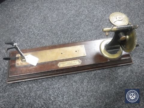 A brass wool tester by Goodbrand and Company Ltd, mounted on board