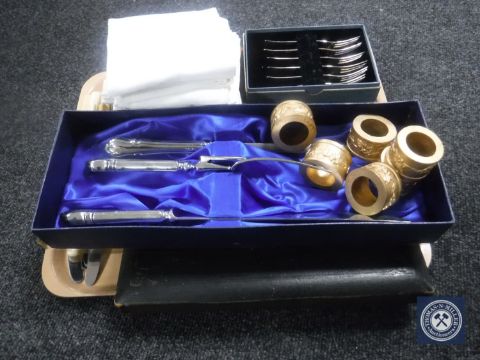 A tray of part canteen of fish cutlery, butter knives, carving set, linen napkins and napkin rings