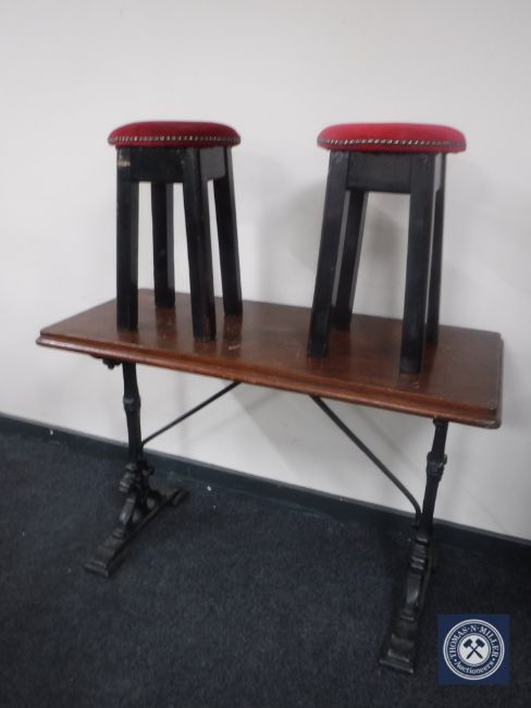 A narrow rectangular pub table on cast iron base together with two upholstered circular stools