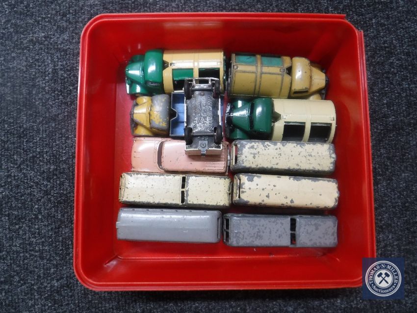 A box of eleven mid 20th century Dinky Toys die cast vehicles - buses, Bedford lorries, Nash Rambler etc