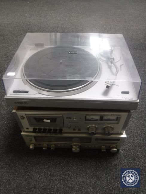 Three hi/fi separates - Sanyo twin cassette deck RD5030, Sony FM/AM programme receiver STR-434L and a Sanyo System 20 turn table
