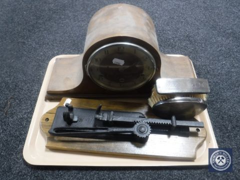 Three silver backed brushes, a walnut cased mantel clock and a metal bottle opener mounted on a board