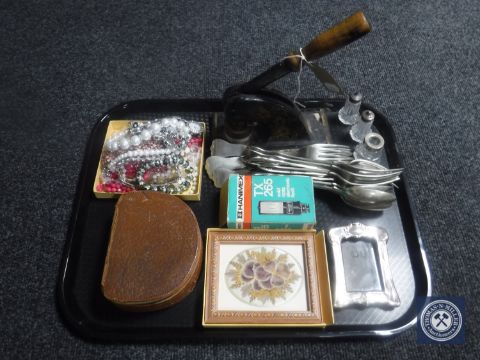 A tray of assorted costume jewellery, Haminex flash, vintage hand painted hole punch, silver and glass miniature cruet set, flatware etc