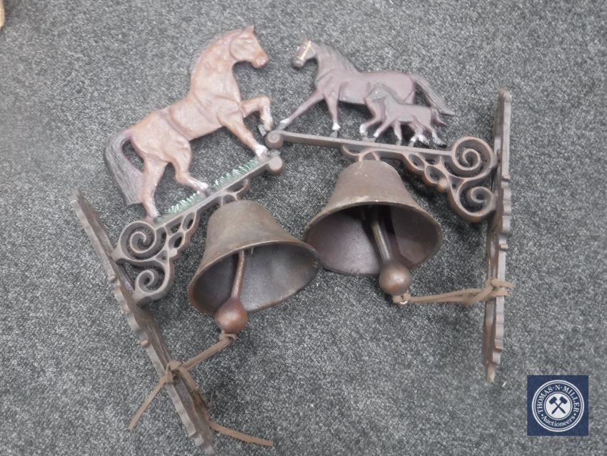 Two cast metal horse wall brackets with bells