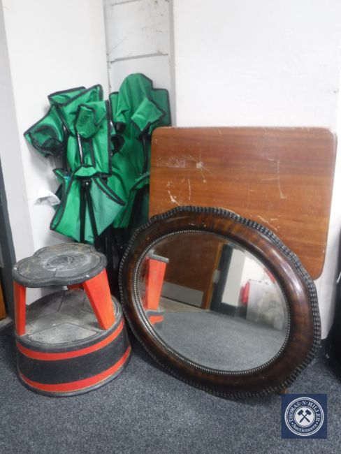 Two folding tables, two folding garden chairs, a caravan step and a Victorian mirror