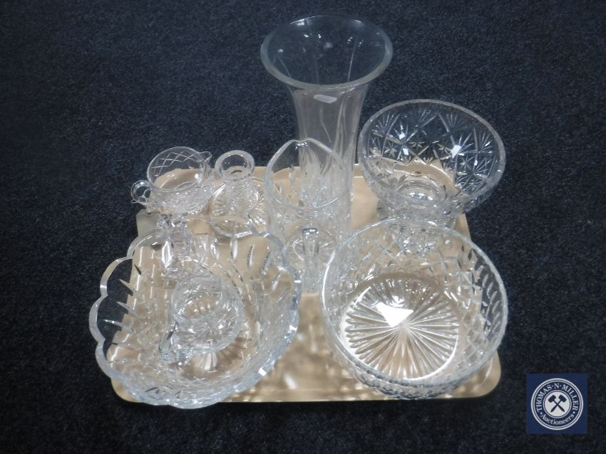 A tray of assorted glass ware - lead crystal candle holders, fruit bowls, water jug etc