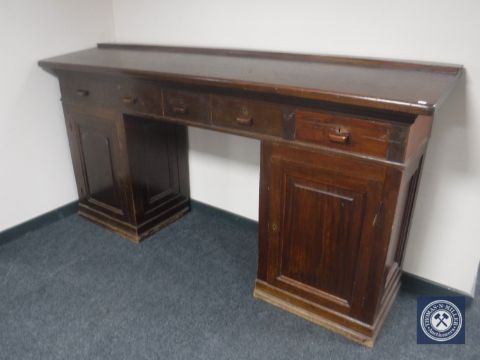 An early 20th century twin pedestal clerk's desk fitted with five drawers