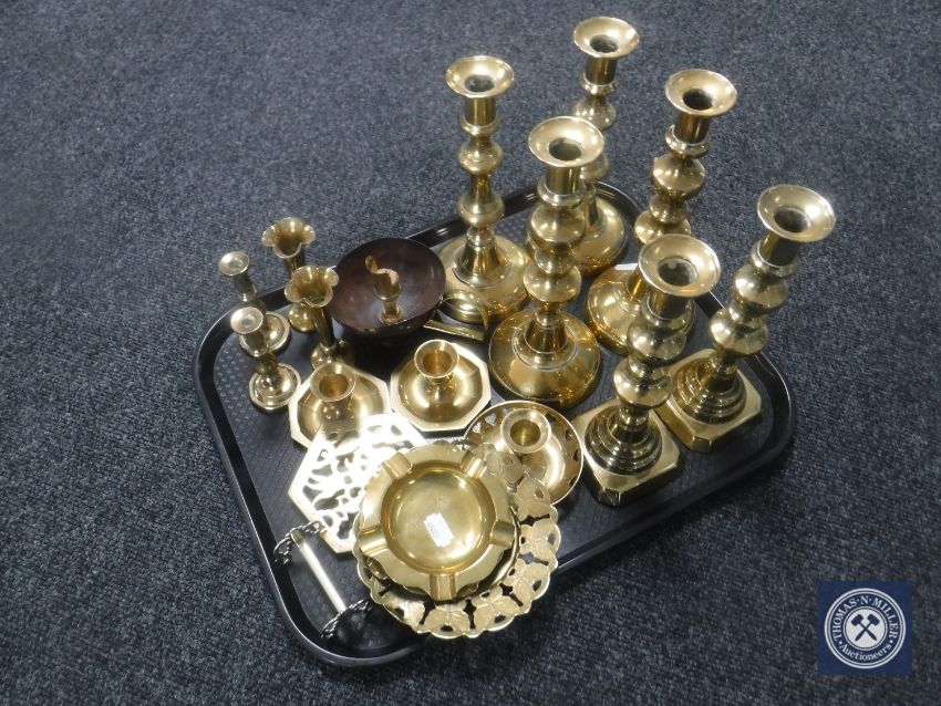 A tray of assorted brass ware, candlesticks and candle holders, ash trays, miniature vases etc
