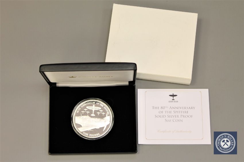 The 80th Anniversary of the Spitfire, a silver proof 5oz £5 coin by the Jubilee Mint, a limited edition of only 99, boxed with certificate